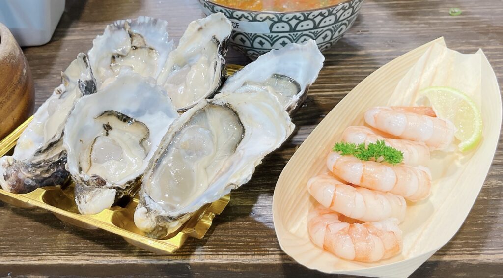 マーケットでは生牡蠣とエビを注文。
